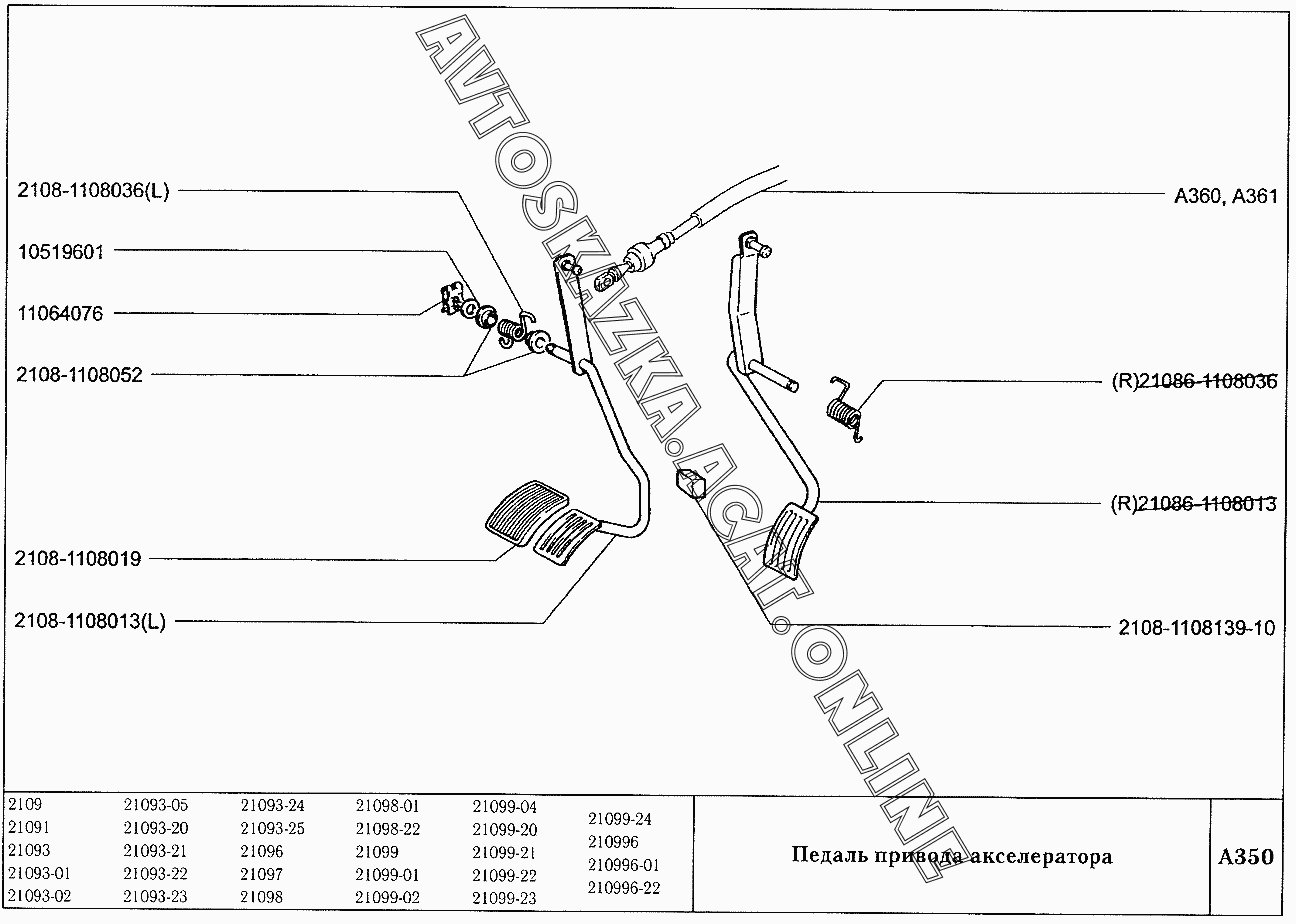 Педаль привода акселератора ВАЗ 21099 (21099, 21099-01, 21099-02, 21099-04, 210996, 210996-01 (карб.), 21099-20, 21099-21, 21099-22, 21099-23, 21099-24, 210996-22 (впрыск))