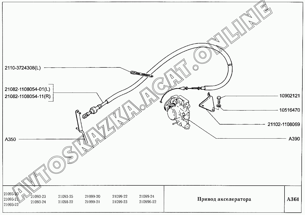 Привод акселератора ВАЗ 21099 (21099, 21099-01, 21099-02, 21099-04, 210996, 210996-01 (карб.), 21099-20, 21099-21, 21099-22, 21099-23, 21099-24, 210996-22 (впрыск))