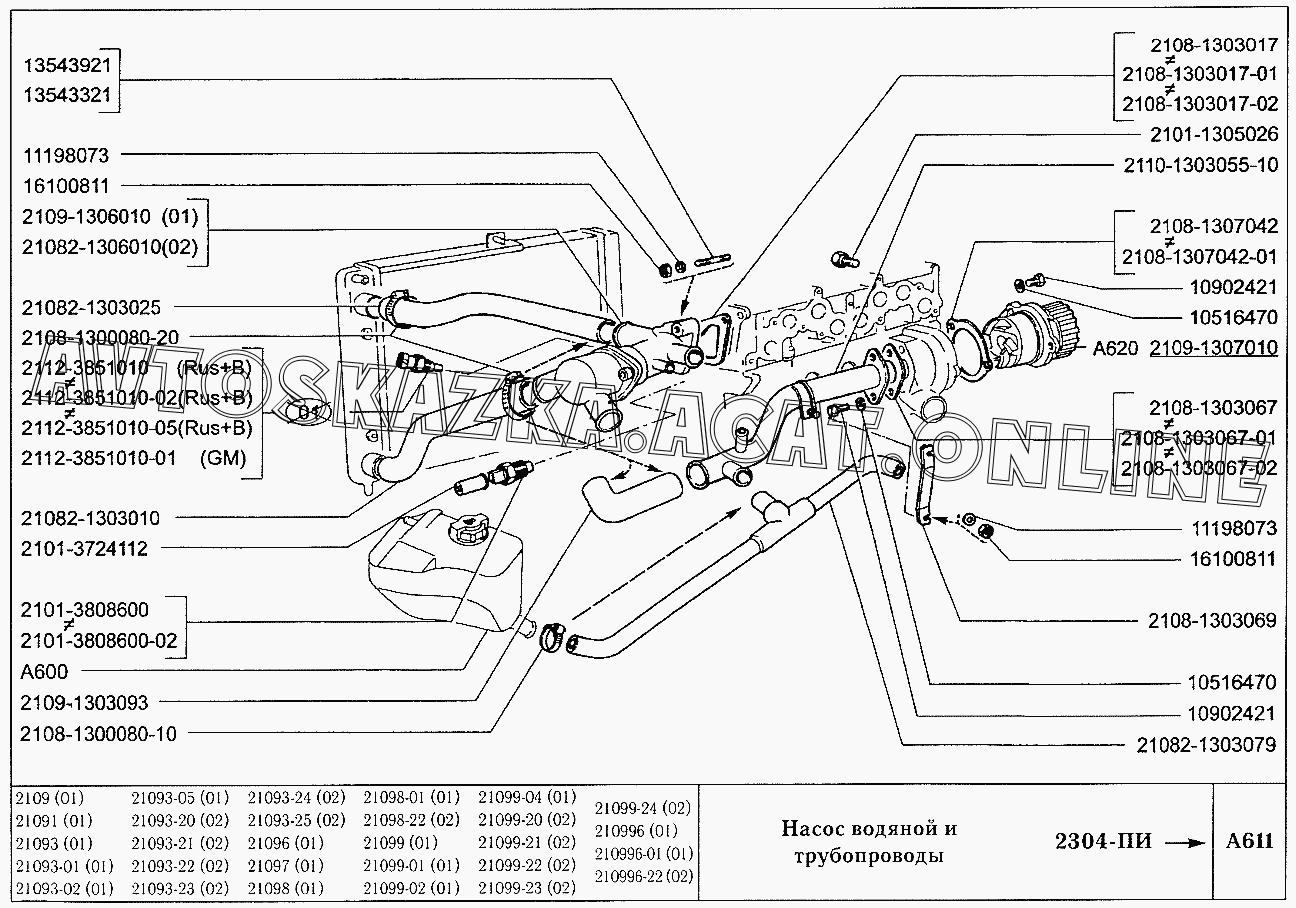 Насос водяной и трубопроводы ВАЗ 21099 (21099, 21099-01, 21099-02, 21099-04, 210996, 210996-01 (карб.), 21099-20, 21099-21, 21099-22, 21099-23, 21099-24, 210996-22 (впрыск))