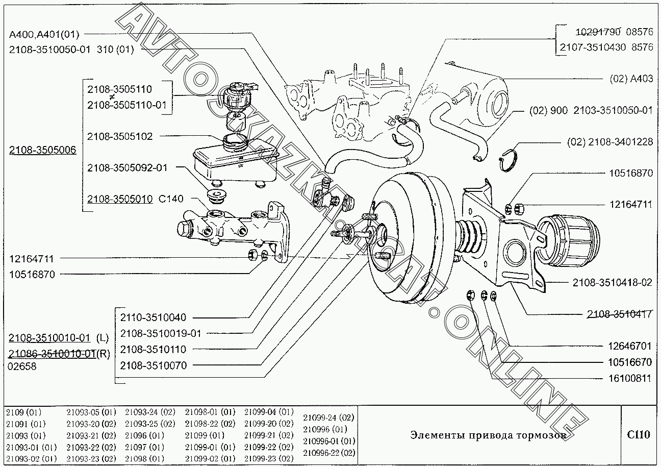 Элементы привода тормозов ВАЗ 21099 (21099, 21099-01, 21099-02, 21099-04, 210996, 210996-01 (карб.), 21099-20, 21099-21, 21099-22, 21099-23, 21099-24, 210996-22 (впрыск))