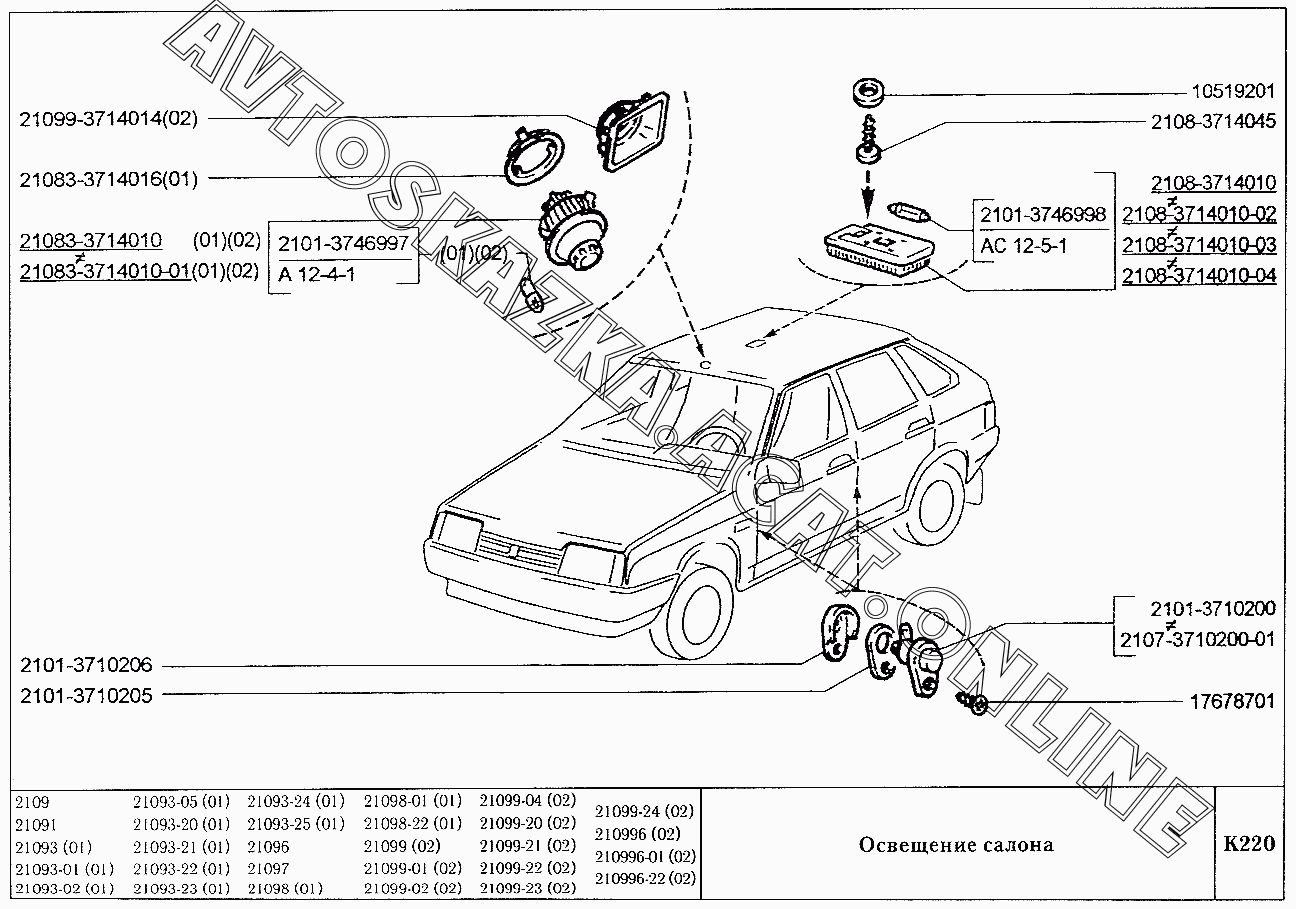 Освещение салона ВАЗ 21099 (21099, 21099-01, 21099-02, 21099-04, 210996, 210996-01 (карб.), 21099-20, 21099-21, 21099-22, 21099-23, 21099-24, 210996-22 (впрыск))