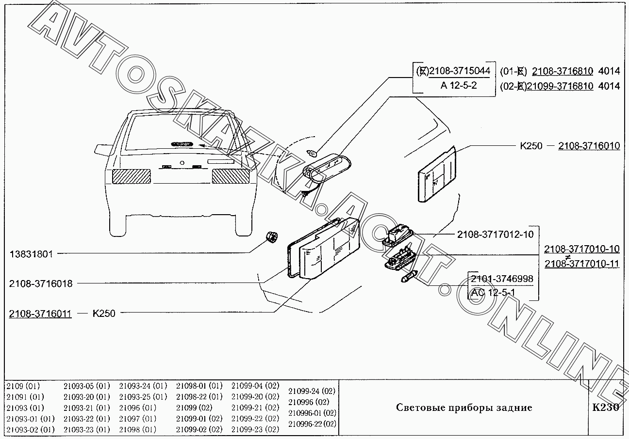 Световые приборы задние ВАЗ 21099 (21099, 21099-01, 21099-02, 21099-04, 210996, 210996-01 (карб.), 21099-20, 21099-21, 21099-22, 21099-23, 21099-24, 210996-22 (впрыск))