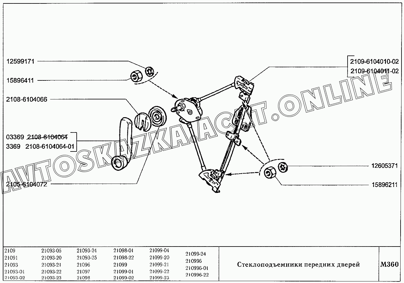 Стеклоподъемники передних дверей ВАЗ 21099 (21099, 21099-01, 21099-02, 21099-04, 210996, 210996-01 (карб.), 21099-20, 21099-21, 21099-22, 21099-23, 21099-24, 210996-22 (впрыск))