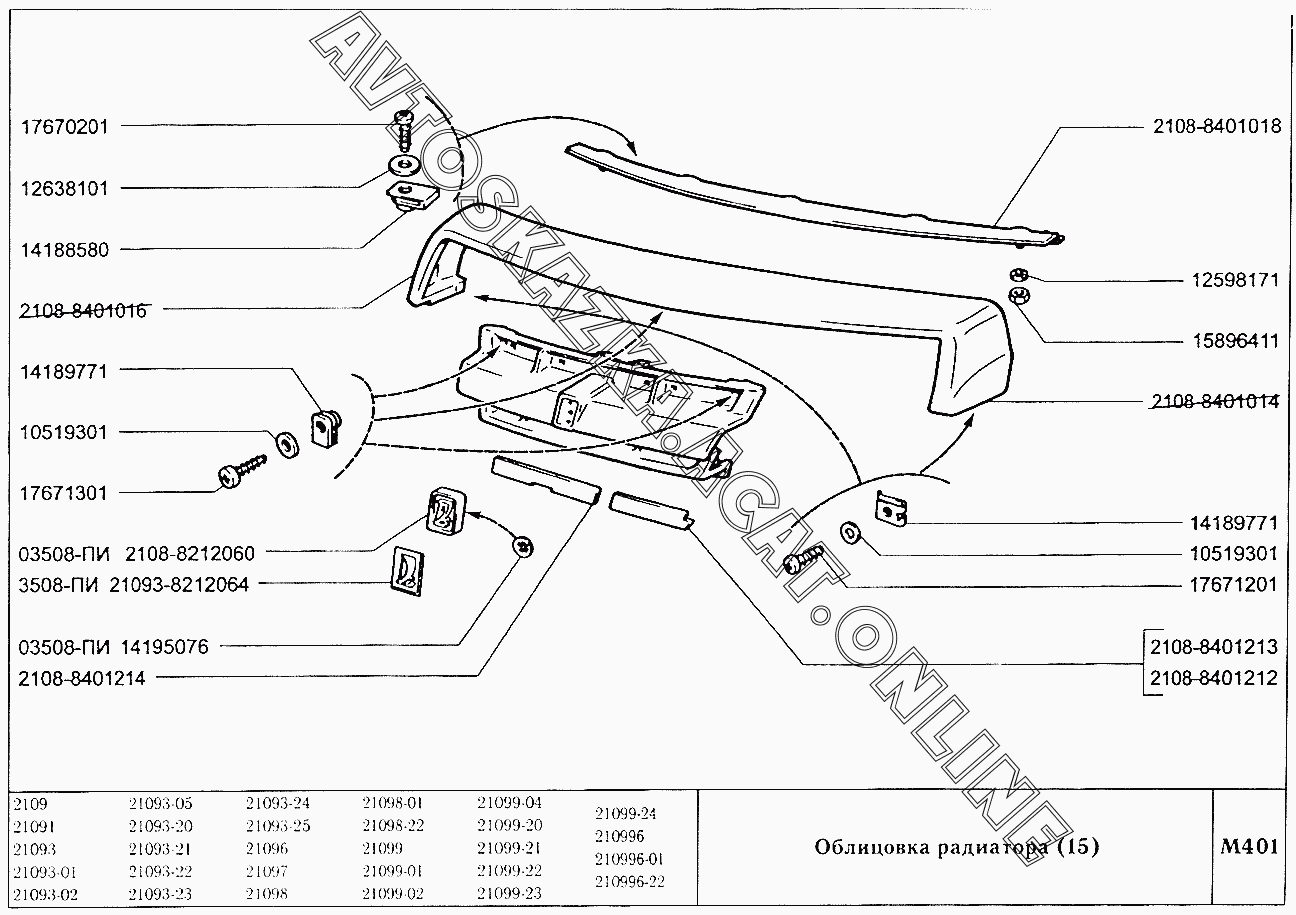 Облицовка радиатора (15) ВАЗ 21099 (21099, 21099-01, 21099-02, 21099-04, 210996, 210996-01 (карб.), 21099-20, 21099-21, 21099-22, 21099-23, 21099-24, 210996-22 (впрыск))