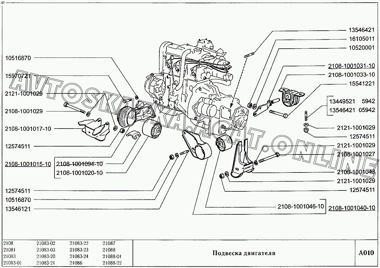 Подвеска двигателя ВАЗ 2108 (2108 (до 01.2000), 21081 (до 05.1997), 21083, 21083-01, 21083-02 (до 09.2000), 21083-03 (до 2000), 21083-20 (до 2000), 21083-21 (до 09.2000), 21083-22 (до 2000), 21083-24 (до 03.2000), 21083-24 (до 2002), 21086, 21087, 21088, 21088-01, 21088-22 (до 1999))