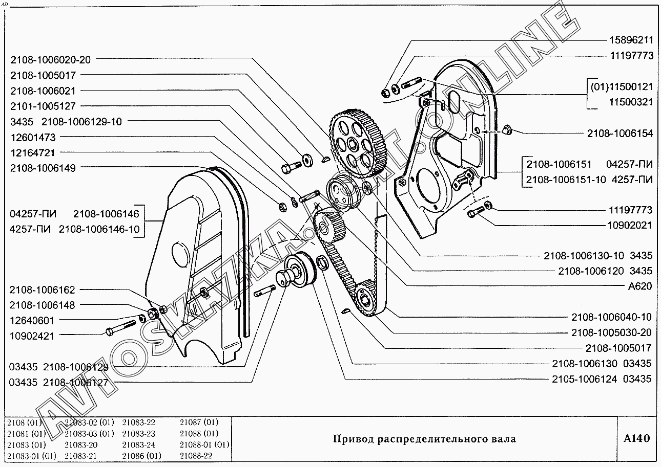 Привод распределительного вала ВАЗ 2108 (2108 (до 01.2000), 21081 (до 05.1997), 21083, 21083-01, 21083-02 (до 09.2000), 21083-03 (до 2000), 21083-20 (до 2000), 21083-21 (до 09.2000), 21083-22 (до 2000), 21083-24 (до 03.2000), 21083-24 (до 2002), 21086, 21087, 21088, 21088-01, 21088-22 (до 1999))