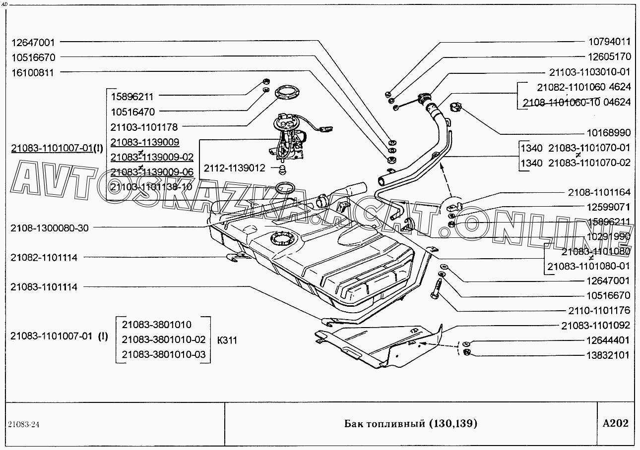 Бак топливный (вариант исполнения 130,139) ВАЗ 2108 (2108 (до 01.2000), 21081 (до 05.1997), 21083, 21083-01, 21083-02 (до 09.2000), 21083-03 (до 2000), 21083-20 (до 2000), 21083-21 (до 09.2000), 21083-22 (до 2000), 21083-24 (до 03.2000), 21083-24 (до 2002), 21086, 21087, 21088, 21088-01, 21088-22 (до 1999))
