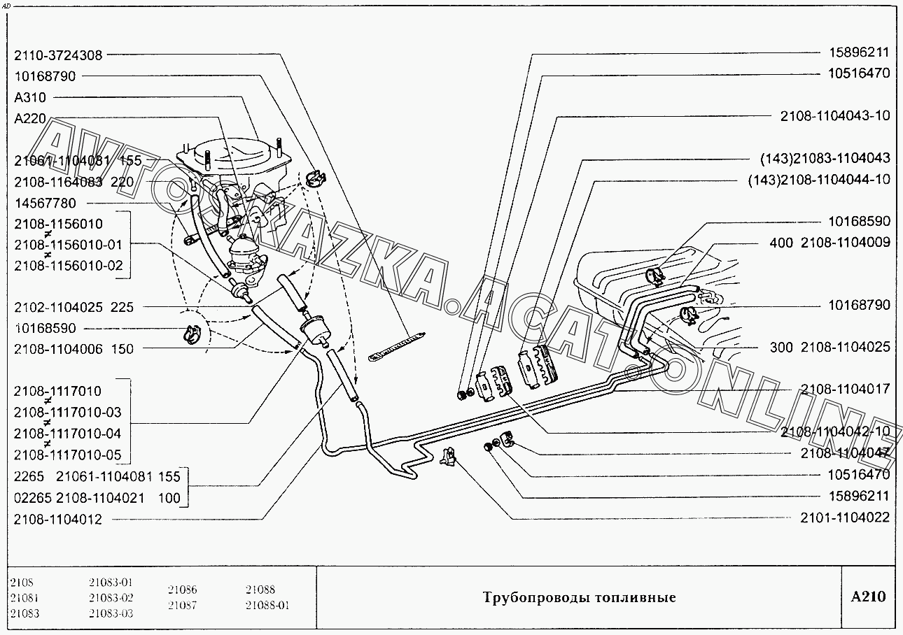 Трубопроводы топливные ВАЗ 2108 (2108 (до 01.2000), 21081 (до 05.1997), 21083, 21083-01, 21083-02 (до 09.2000), 21083-03 (до 2000), 21083-20 (до 2000), 21083-21 (до 09.2000), 21083-22 (до 2000), 21083-24 (до 03.2000), 21083-24 (до 2002), 21086, 21087, 21088, 21088-01, 21088-22 (до 1999))