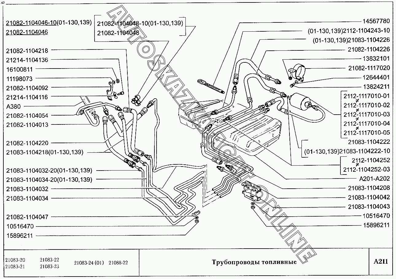 Трубопроводы топливные ВАЗ 2108 (2108 (до 01.2000), 21081 (до 05.1997), 21083, 21083-01, 21083-02 (до 09.2000), 21083-03 (до 2000), 21083-20 (до 2000), 21083-21 (до 09.2000), 21083-22 (до 2000), 21083-24 (до 03.2000), 21083-24 (до 2002), 21086, 21087, 21088, 21088-01, 21088-22 (до 1999))