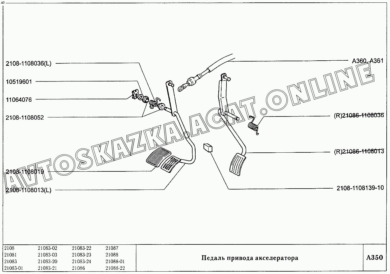 Педаль привода акселератора ВАЗ 2108 (2108 (до 01.2000), 21081 (до 05.1997), 21083, 21083-01, 21083-02 (до 09.2000), 21083-03 (до 2000), 21083-20 (до 2000), 21083-21 (до 09.2000), 21083-22 (до 2000), 21083-24 (до 03.2000), 21083-24 (до 2002), 21086, 21087, 21088, 21088-01, 21088-22 (до 1999))