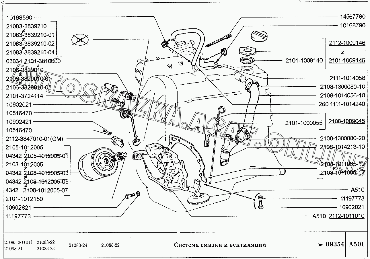 Система смазки и вентиляции ВАЗ 2108 (2108 (до 01.2000), 21081 (до 05.1997), 21083, 21083-01, 21083-02 (до 09.2000), 21083-03 (до 2000), 21083-20 (до 2000), 21083-21 (до 09.2000), 21083-22 (до 2000), 21083-24 (до 03.2000), 21083-24 (до 2002), 21086, 21087, 21088, 21088-01, 21088-22 (до 1999))