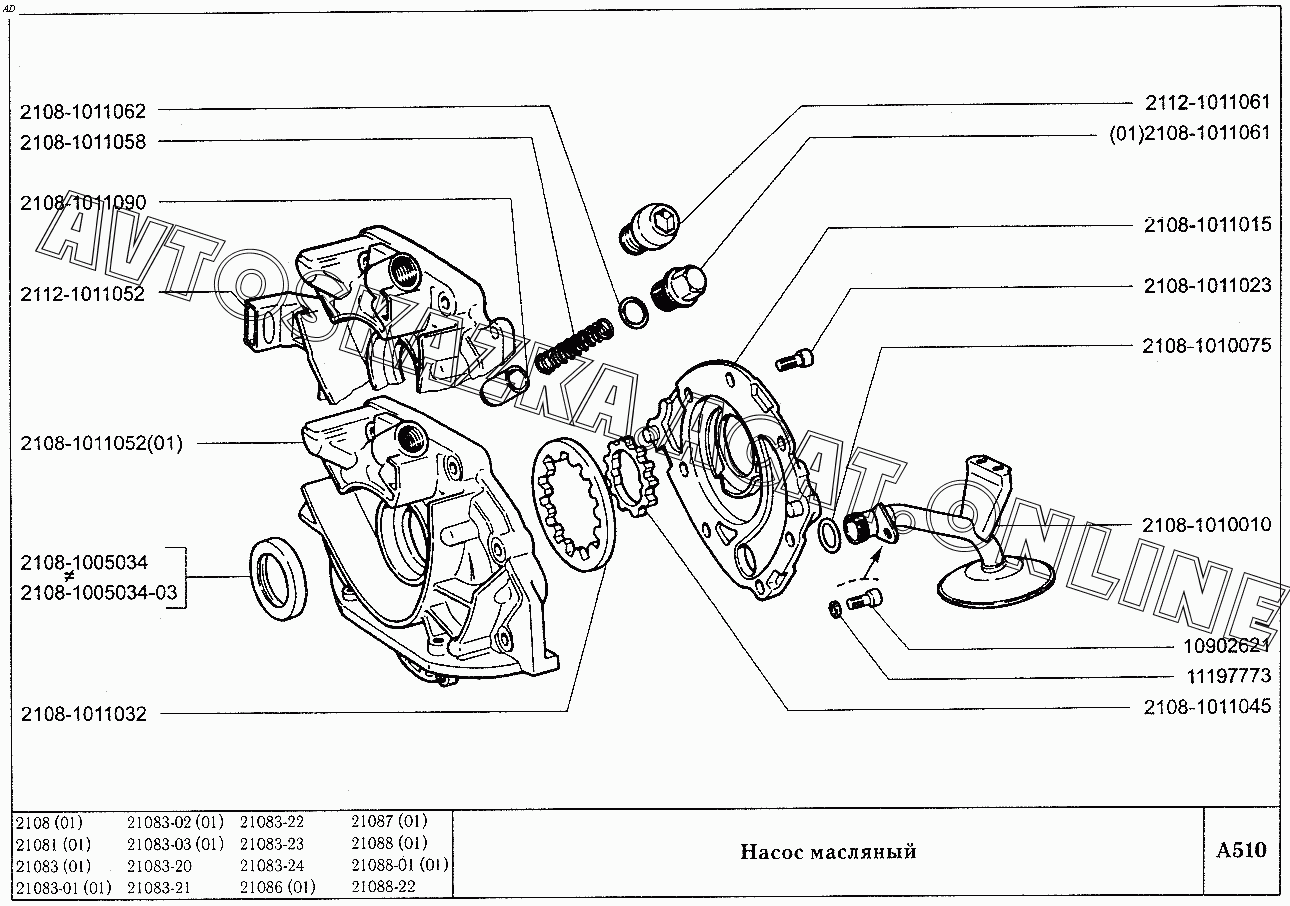 Насос масляный ВАЗ 2108 (2108 (до 01.2000), 21081 (до 05.1997), 21083, 21083-01, 21083-02 (до 09.2000), 21083-03 (до 2000), 21083-20 (до 2000), 21083-21 (до 09.2000), 21083-22 (до 2000), 21083-24 (до 03.2000), 21083-24 (до 2002), 21086, 21087, 21088, 21088-01, 21088-22 (до 1999))