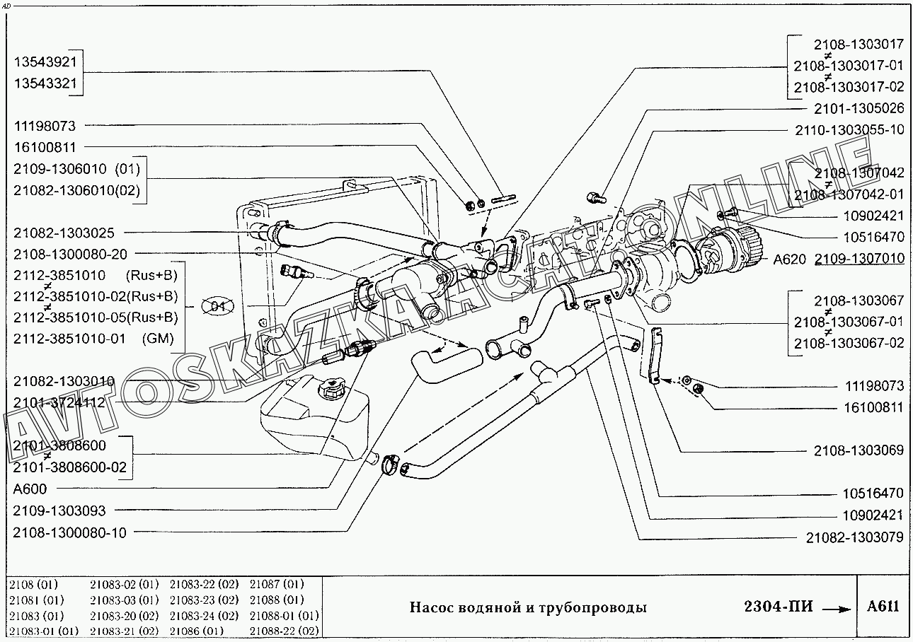 Насос водяной и трубопроводы ВАЗ 2108 (2108 (до 01.2000), 21081 (до 05.1997), 21083, 21083-01, 21083-02 (до 09.2000), 21083-03 (до 2000), 21083-20 (до 2000), 21083-21 (до 09.2000), 21083-22 (до 2000), 21083-24 (до 03.2000), 21083-24 (до 2002), 21086, 21087, 21088, 21088-01, 21088-22 (до 1999))