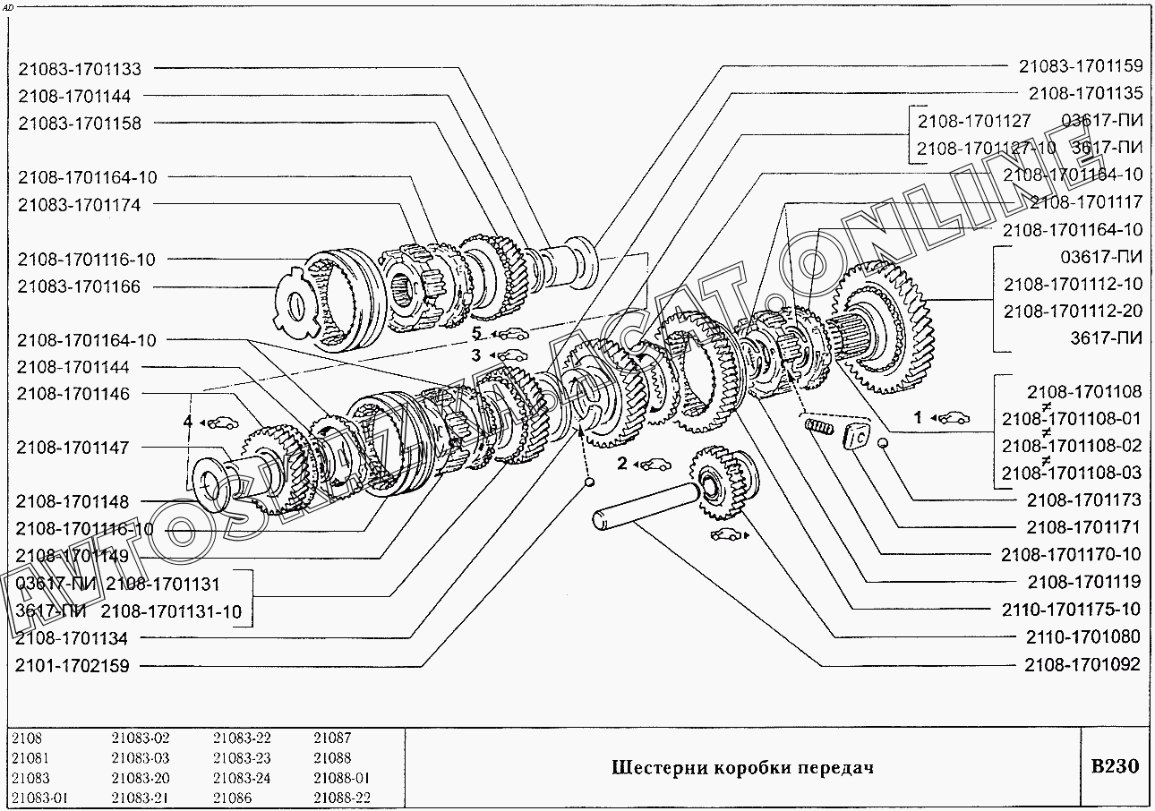 Шестерни коробки передач ВАЗ 2108 (2108 (до 01.2000), 21081 (до 05.1997), 21083, 21083-01, 21083-02 (до 09.2000), 21083-03 (до 2000), 21083-20 (до 2000), 21083-21 (до 09.2000), 21083-22 (до 2000), 21083-24 (до 03.2000), 21083-24 (до 2002), 21086, 21087, 21088, 21088-01, 21088-22 (до 1999))