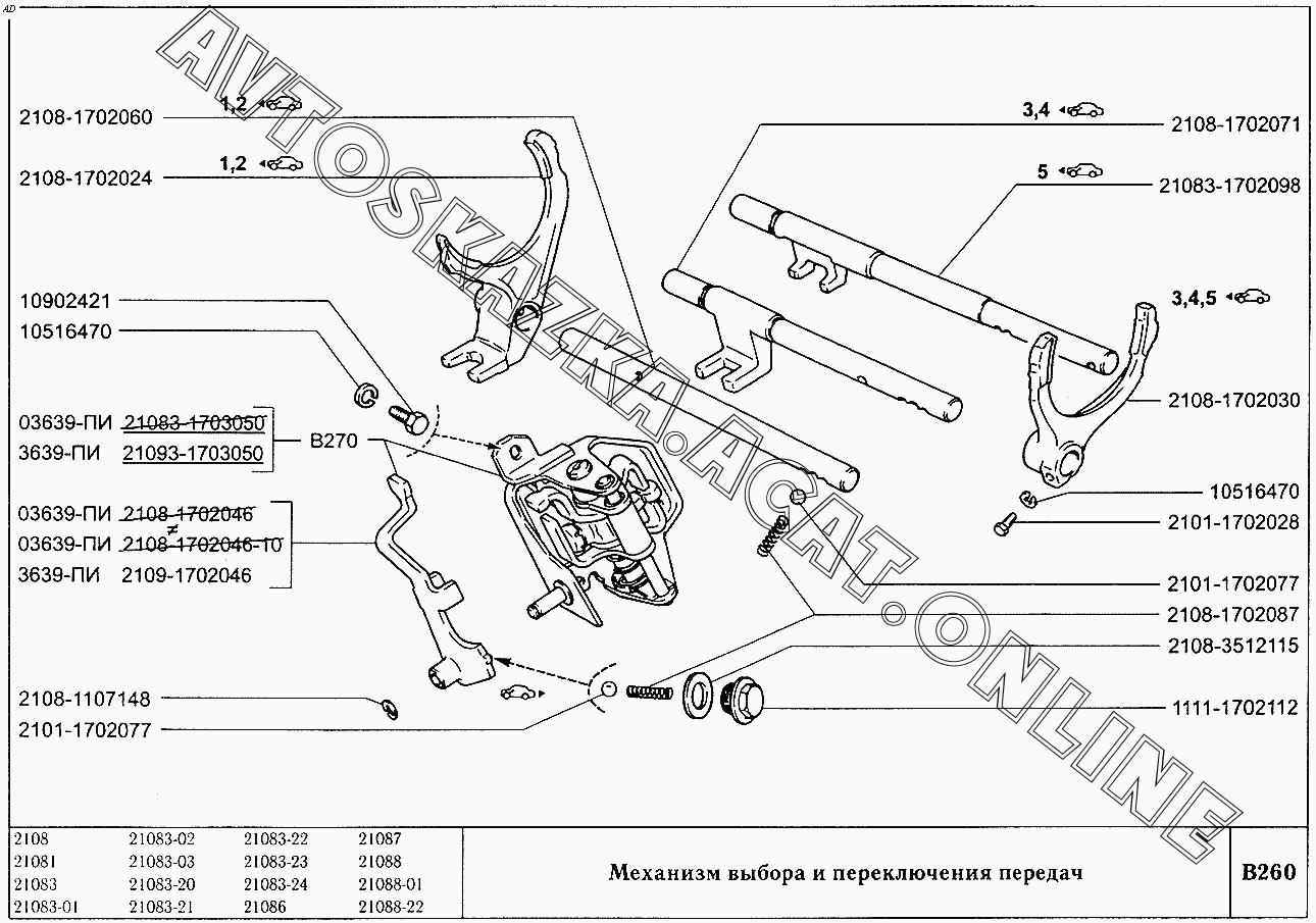 Механизм выбора и переключения передач ВАЗ 2108 (2108 (до 01.2000), 21081 (до 05.1997), 21083, 21083-01, 21083-02 (до 09.2000), 21083-03 (до 2000), 21083-20 (до 2000), 21083-21 (до 09.2000), 21083-22 (до 2000), 21083-24 (до 03.2000), 21083-24 (до 2002), 21086, 21087, 21088, 21088-01, 21088-22 (до 1999))