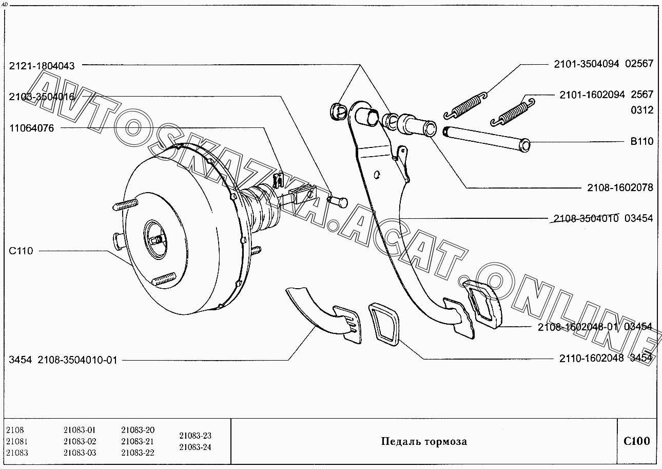 Педаль тормоза ВАЗ 2108 (2108 (до 01.2000), 21081 (до 05.1997), 21083, 21083-01, 21083-02 (до 09.2000), 21083-03 (до 2000), 21083-20 (до 2000), 21083-21 (до 09.2000), 21083-22 (до 2000), 21083-24 (до 03.2000), 21083-24 (до 2002), 21086, 21087, 21088, 21088-01, 21088-22 (до 1999))