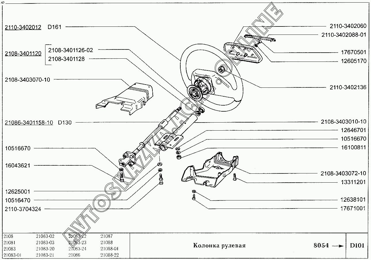 Колонка рулевая ВАЗ 2108 (2108 (до 01.2000), 21081 (до 05.1997), 21083, 21083-01, 21083-02 (до 09.2000), 21083-03 (до 2000), 21083-20 (до 2000), 21083-21 (до 09.2000), 21083-22 (до 2000), 21083-24 (до 03.2000), 21083-24 (до 2002), 21086, 21087, 21088, 21088-01, 21088-22 (до 1999))
