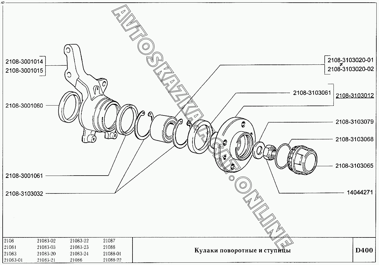 Кулаки поворотные и ступицы ВАЗ 2108 (2108 (до 01.2000), 21081 (до 05.1997), 21083, 21083-01, 21083-02 (до 09.2000), 21083-03 (до 2000), 21083-20 (до 2000), 21083-21 (до 09.2000), 21083-22 (до 2000), 21083-24 (до 03.2000), 21083-24 (до 2002), 21086, 21087, 21088, 21088-01, 21088-22 (до 1999))