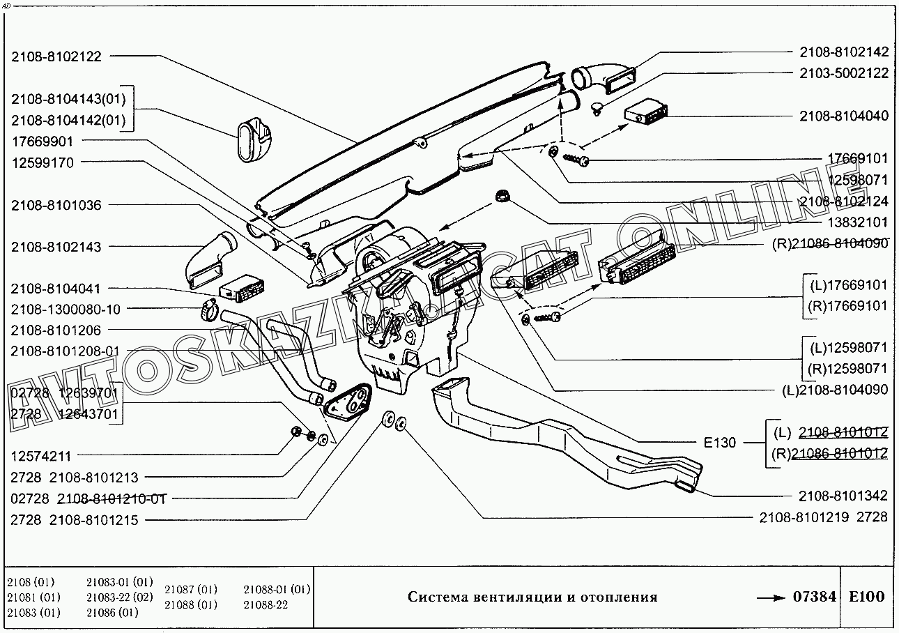 Система вентиляции и отопления ВАЗ 2108 (2108 (до 01.2000), 21081 (до 05.1997), 21083, 21083-01, 21083-02 (до 09.2000), 21083-03 (до 2000), 21083-20 (до 2000), 21083-21 (до 09.2000), 21083-22 (до 2000), 21083-24 (до 03.2000), 21083-24 (до 2002), 21086, 21087, 21088, 21088-01, 21088-22 (до 1999))