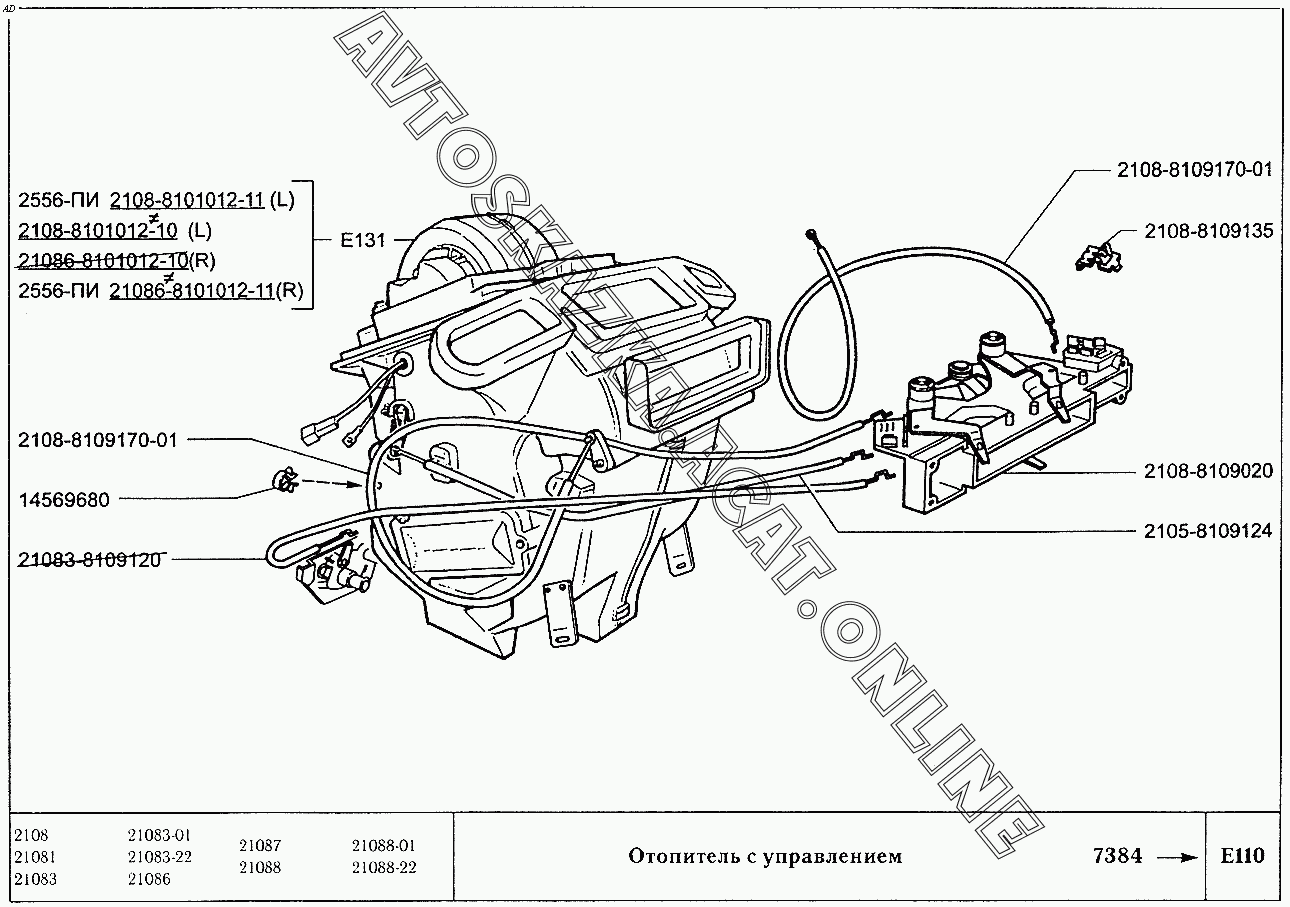 Отопитель с управлением ВАЗ 2108 (2108 (до 01.2000), 21081 (до 05.1997), 21083, 21083-01, 21083-02 (до 09.2000), 21083-03 (до 2000), 21083-20 (до 2000), 21083-21 (до 09.2000), 21083-22 (до 2000), 21083-24 (до 03.2000), 21083-24 (до 2002), 21086, 21087, 21088, 21088-01, 21088-22 (до 1999))