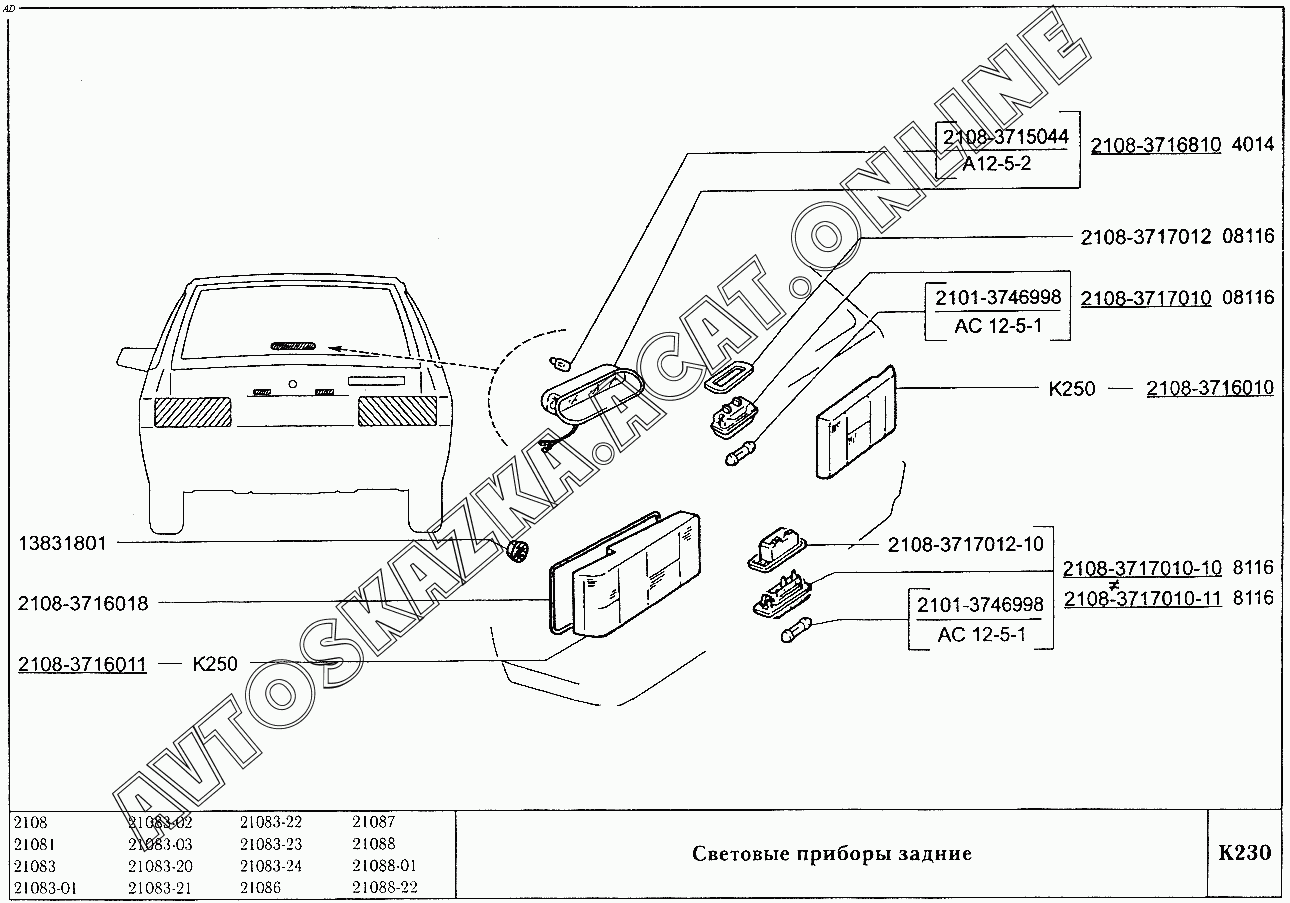 Световые приборы задние ВАЗ 2108 (2108 (до 01.2000), 21081 (до 05.1997), 21083, 21083-01, 21083-02 (до 09.2000), 21083-03 (до 2000), 21083-20 (до 2000), 21083-21 (до 09.2000), 21083-22 (до 2000), 21083-24 (до 03.2000), 21083-24 (до 2002), 21086, 21087, 21088, 21088-01, 21088-22 (до 1999))