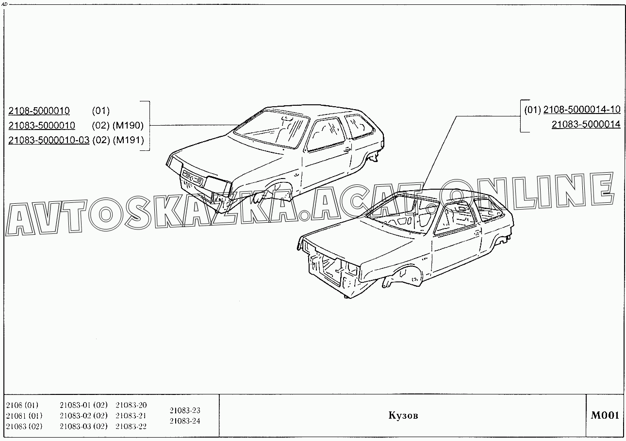 Кузов ВАЗ 2108 (2108 (до 01.2000), 21081 (до 05.1997), 21083, 21083-01, 21083-02 (до 09.2000), 21083-03 (до 2000), 21083-20 (до 2000), 21083-21 (до 09.2000), 21083-22 (до 2000), 21083-24 (до 03.2000), 21083-24 (до 2002), 21086, 21087, 21088, 21088-01, 21088-22 (до 1999))
