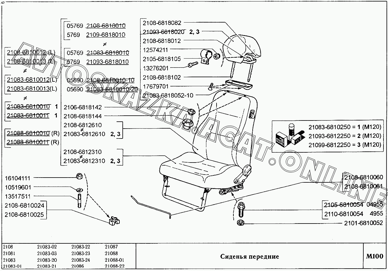 Сиденья передние ВАЗ 2108 (2108 (до 01.2000), 21081 (до 05.1997), 21083, 21083-01, 21083-02 (до 09.2000), 21083-03 (до 2000), 21083-20 (до 2000), 21083-21 (до 09.2000), 21083-22 (до 2000), 21083-24 (до 03.2000), 21083-24 (до 2002), 21086, 21087, 21088, 21088-01, 21088-22 (до 1999))