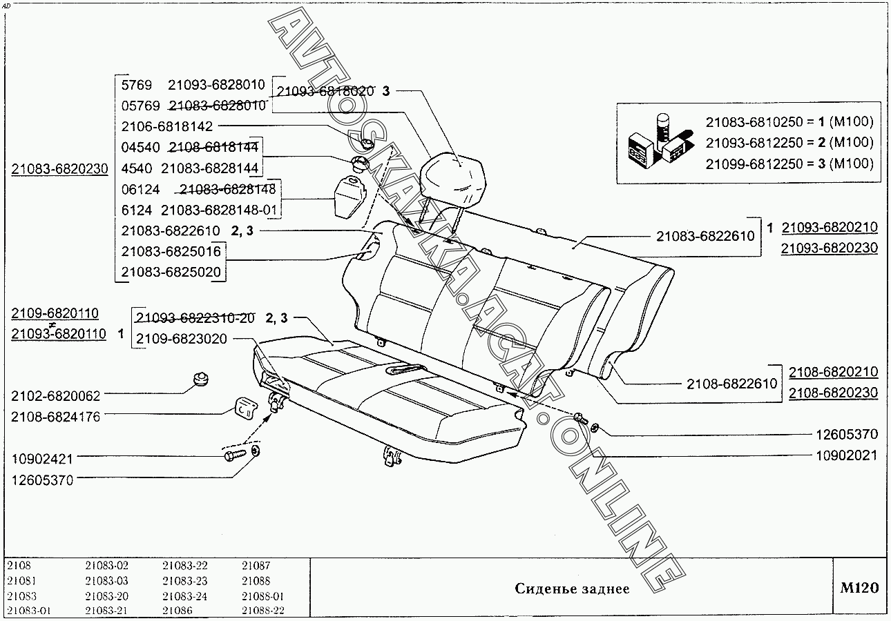 Сиденье заднее ВАЗ 2108 (2108 (до 01.2000), 21081 (до 05.1997), 21083, 21083-01, 21083-02 (до 09.2000), 21083-03 (до 2000), 21083-20 (до 2000), 21083-21 (до 09.2000), 21083-22 (до 2000), 21083-24 (до 03.2000), 21083-24 (до 2002), 21086, 21087, 21088, 21088-01, 21088-22 (до 1999))