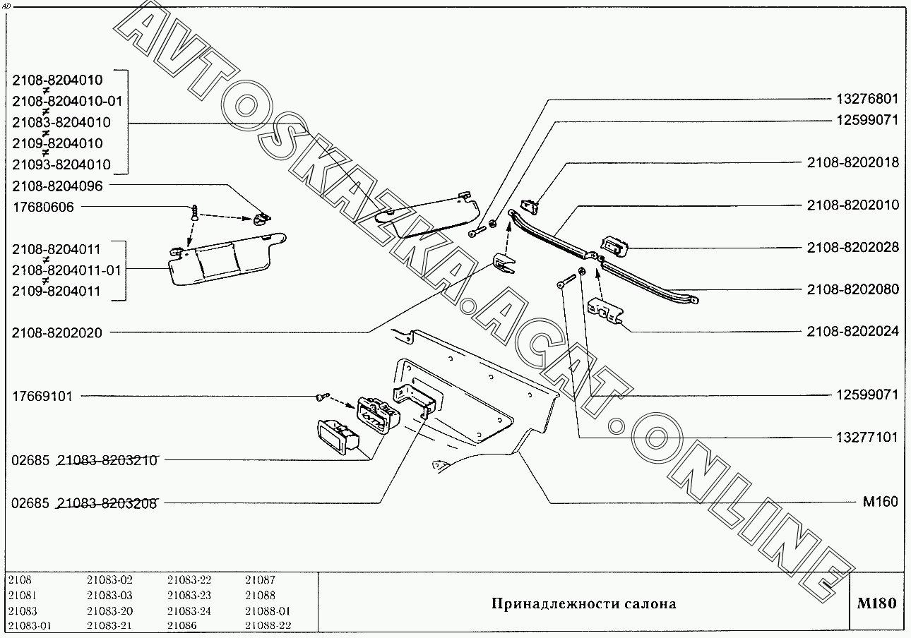 Принадлежности салона ВАЗ 2108 (2108 (до 01.2000), 21081 (до 05.1997), 21083, 21083-01, 21083-02 (до 09.2000), 21083-03 (до 2000), 21083-20 (до 2000), 21083-21 (до 09.2000), 21083-22 (до 2000), 21083-24 (до 03.2000), 21083-24 (до 2002), 21086, 21087, 21088, 21088-01, 21088-22 (до 1999))