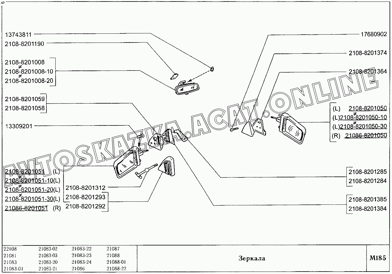 Зеркала ВАЗ 2108 (2108 (до 01.2000), 21081 (до 05.1997), 21083, 21083-01, 21083-02 (до 09.2000), 21083-03 (до 2000), 21083-20 (до 2000), 21083-21 (до 09.2000), 21083-22 (до 2000), 21083-24 (до 03.2000), 21083-24 (до 2002), 21086, 21087, 21088, 21088-01, 21088-22 (до 1999))