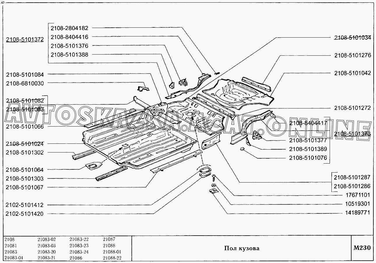 Пол кузова ВАЗ 2108 (2108 (до 01.2000), 21081 (до 05.1997), 21083, 21083-01, 21083-02 (до 09.2000), 21083-03 (до 2000), 21083-20 (до 2000), 21083-21 (до 09.2000), 21083-22 (до 2000), 21083-24 (до 03.2000), 21083-24 (до 2002), 21086, 21087, 21088, 21088-01, 21088-22 (до 1999))