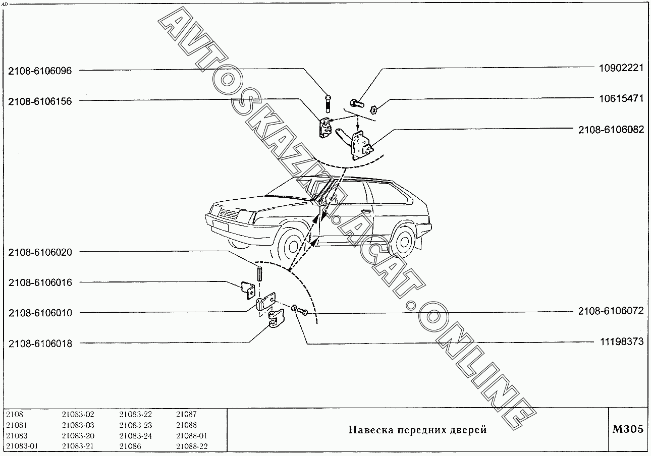 Навеска передних дверей ВАЗ 2108 (2108 (до 01.2000), 21081 (до 05.1997), 21083, 21083-01, 21083-02 (до 09.2000), 21083-03 (до 2000), 21083-20 (до 2000), 21083-21 (до 09.2000), 21083-22 (до 2000), 21083-24 (до 03.2000), 21083-24 (до 2002), 21086, 21087, 21088, 21088-01, 21088-22 (до 1999))