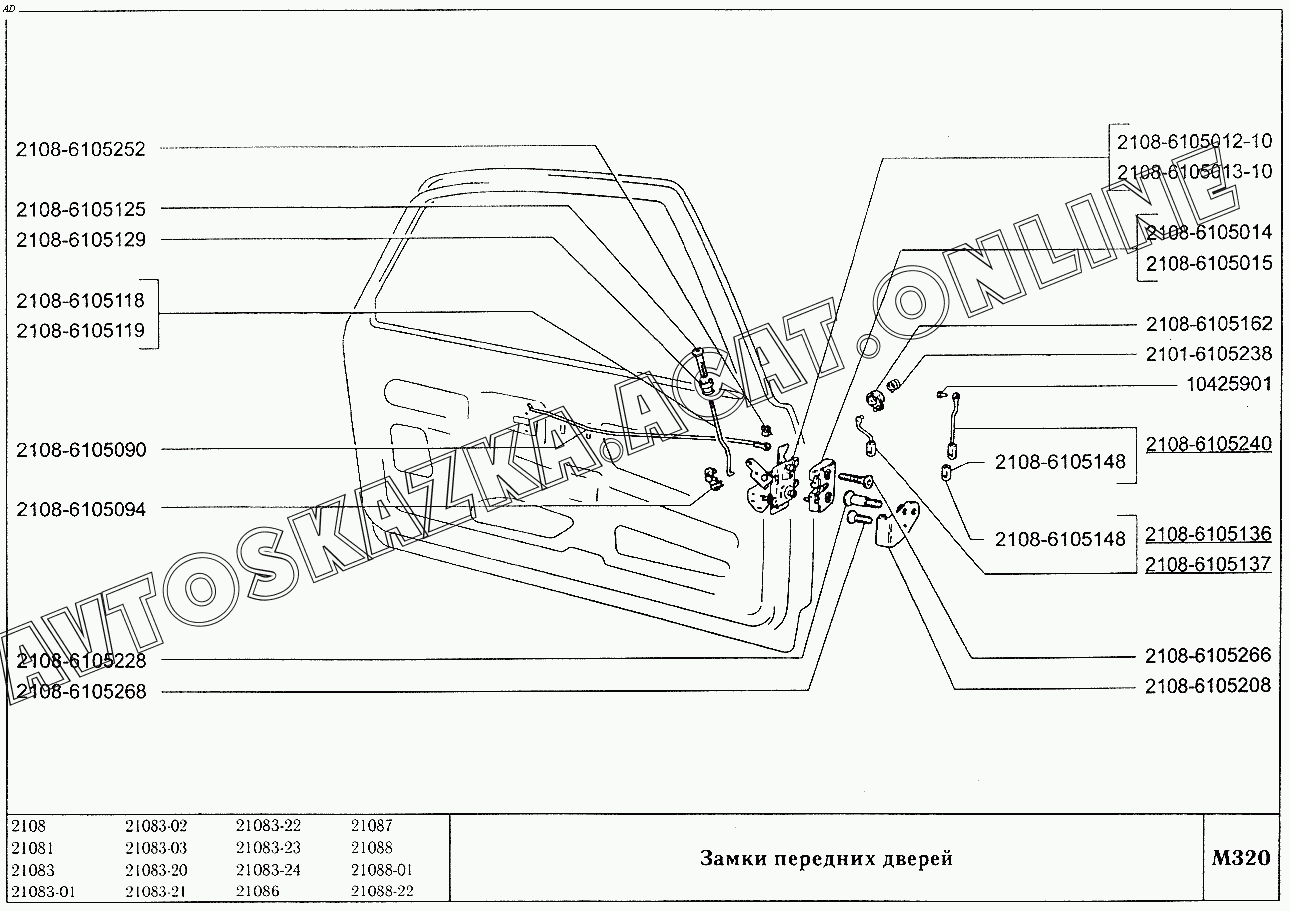 Замки передних дверей ВАЗ 2108 (2108 (до 01.2000), 21081 (до 05.1997), 21083, 21083-01, 21083-02 (до 09.2000), 21083-03 (до 2000), 21083-20 (до 2000), 21083-21 (до 09.2000), 21083-22 (до 2000), 21083-24 (до 03.2000), 21083-24 (до 2002), 21086, 21087, 21088, 21088-01, 21088-22 (до 1999))