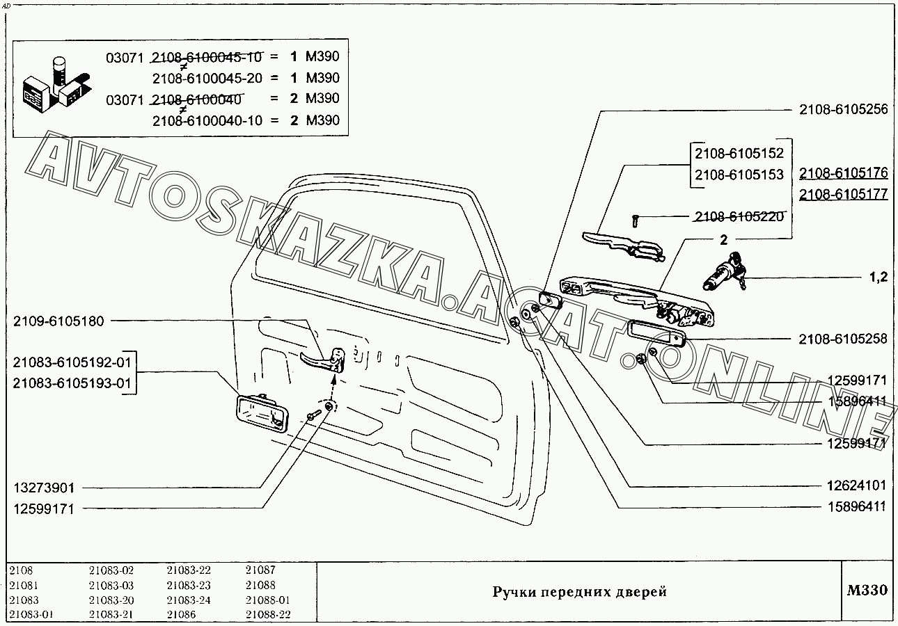 Ручки передних дверей ВАЗ 2108 (2108 (до 01.2000), 21081 (до 05.1997), 21083, 21083-01, 21083-02 (до 09.2000), 21083-03 (до 2000), 21083-20 (до 2000), 21083-21 (до 09.2000), 21083-22 (до 2000), 21083-24 (до 03.2000), 21083-24 (до 2002), 21086, 21087, 21088, 21088-01, 21088-22 (до 1999))