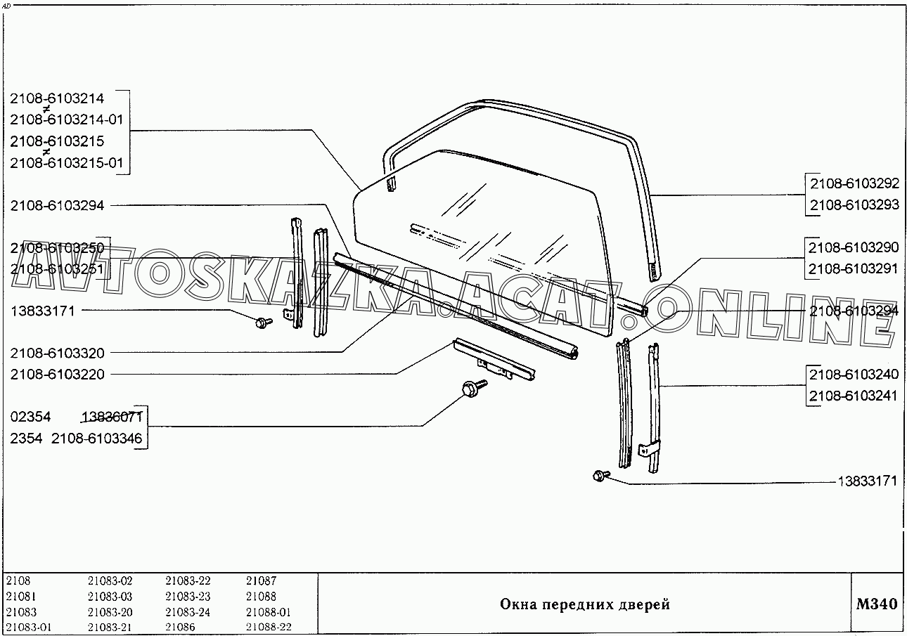 Окна передних дверей ВАЗ 2108 (2108 (до 01.2000), 21081 (до 05.1997), 21083, 21083-01, 21083-02 (до 09.2000), 21083-03 (до 2000), 21083-20 (до 2000), 21083-21 (до 09.2000), 21083-22 (до 2000), 21083-24 (до 03.2000), 21083-24 (до 2002), 21086, 21087, 21088, 21088-01, 21088-22 (до 1999))