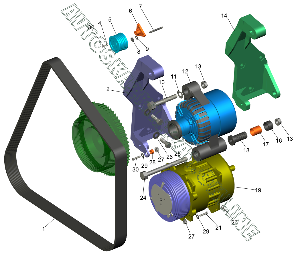 Привод вспомогательных агрегатов с генератором и компрессором ВАЗ 2111 (2111, 21112, 21112-01, 21112-02, 21112-51, 21112-52, 21113, 21114, 21114-01, 21114-02, 21114-51, 21114-52)