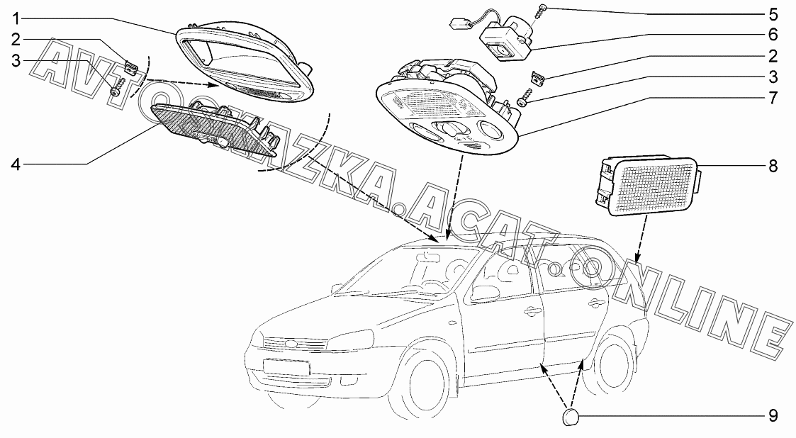 Освещение салона ВАЗ 1117 (11173-30, 11173-31, 11173-33, 11173-40, 11173-41, 11173-43, 11174-30, 11174-33, 11174-40, 11174-43, 11174-50, 11174-53 - "Калина" (универсал))