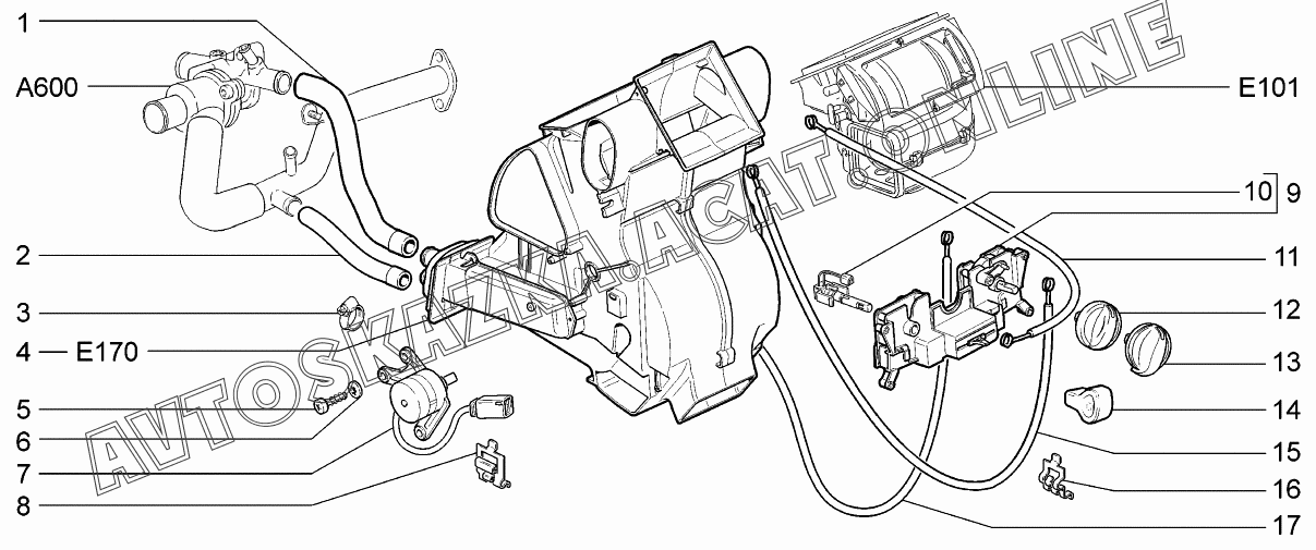 Отопитель с управлением и шлангами (климатическая установка) ВАЗ 1117 (11173-30, 11173-31, 11173-33, 11173-40, 11173-41, 11173-43, 11174-30, 11174-33, 11174-40, 11174-43, 11174-50, 11174-53 - "Калина" (универсал))