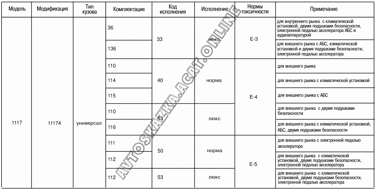 Модификации и комплектации автомобилей ВАЗ 1117 (11173-30, 11173-31, 11173-33, 11173-40, 11173-41, 11173-43, 11174-30, 11174-33, 11174-40, 11174-43, 11174-50, 11174-53 - "Калина" (универсал))
