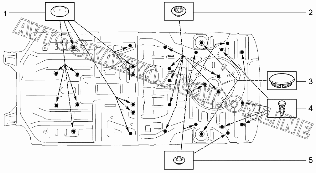 Схема установки заглушек ВАЗ 1117 (11173-30, 11173-31, 11173-33, 11173-40, 11173-41, 11173-43, 11174-30, 11174-33, 11174-40, 11174-43, 11174-50, 11174-53 - "Калина" (универсал))