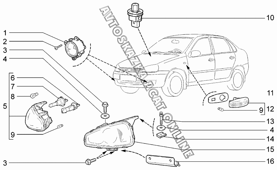 Освещение переднее ВАЗ 1118 (11183-30, 11183-31, 11183-33, 11183-40, 11183-41, 11183-43, 11184-30, 11184-33, 11184-40, 11184-43 - "Калина" (седан) )