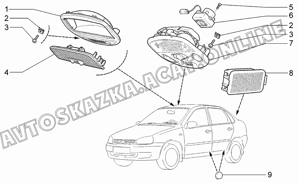 Освещение салона ВАЗ 1118 (11183-30, 11183-31, 11183-33, 11183-40, 11183-41, 11183-43, 11184-30, 11184-33, 11184-40, 11184-43 - "Калина" (седан) )