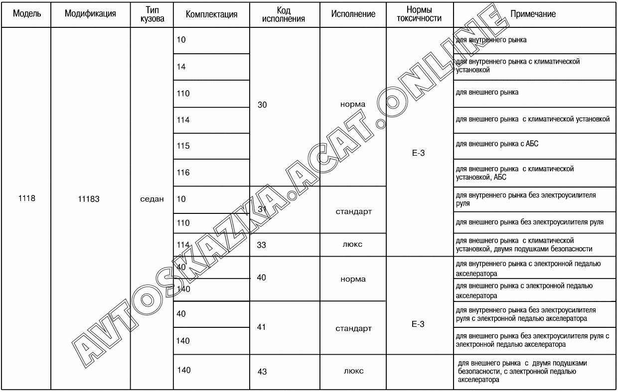 Модификации и комплектации автомобилей ВАЗ 1118 (11183-30, 11183-31, 11183-33, 11183-40, 11183-41, 11183-43, 11184-30, 11184-33, 11184-40, 11184-43 - "Калина" (седан) )