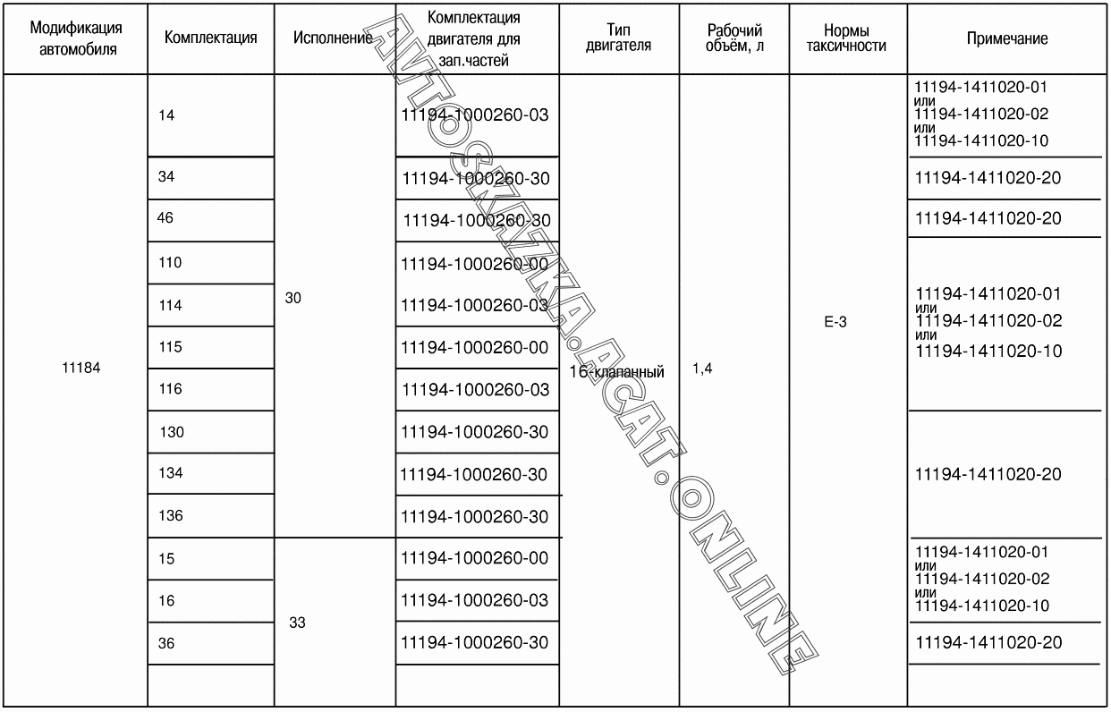 Комплектации двигателей для автомобилей ВАЗ 1118 (11183-30, 11183-31, 11183-33, 11183-40, 11183-41, 11183-43, 11184-30, 11184-33, 11184-40, 11184-43 - "Калина" (седан) )