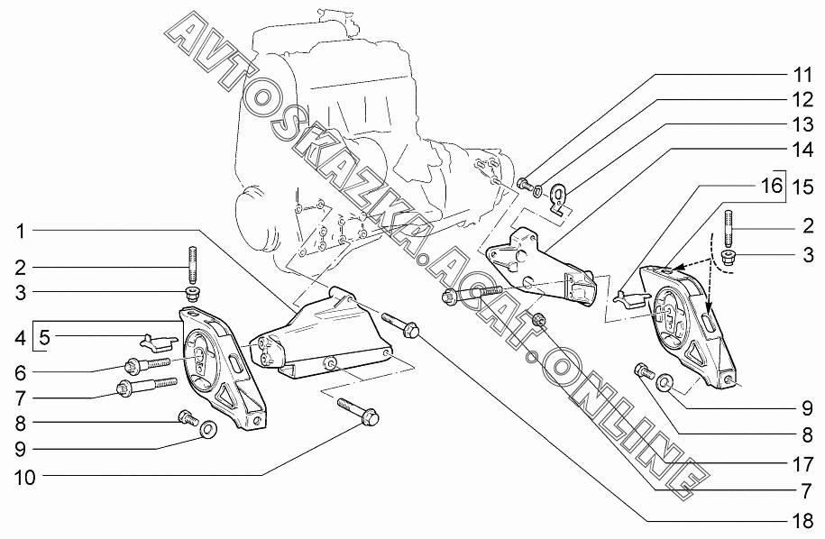 Подвеска двигателя ВАЗ 1119 (11193-30, 11193-31, 11193-33, 11193-40, 11193-41, 11193-43, 11194-30, 11194-33, 11194-40, 11194-43, 11194-50, 11194-53 - "Калина" (хэтчбек) )
