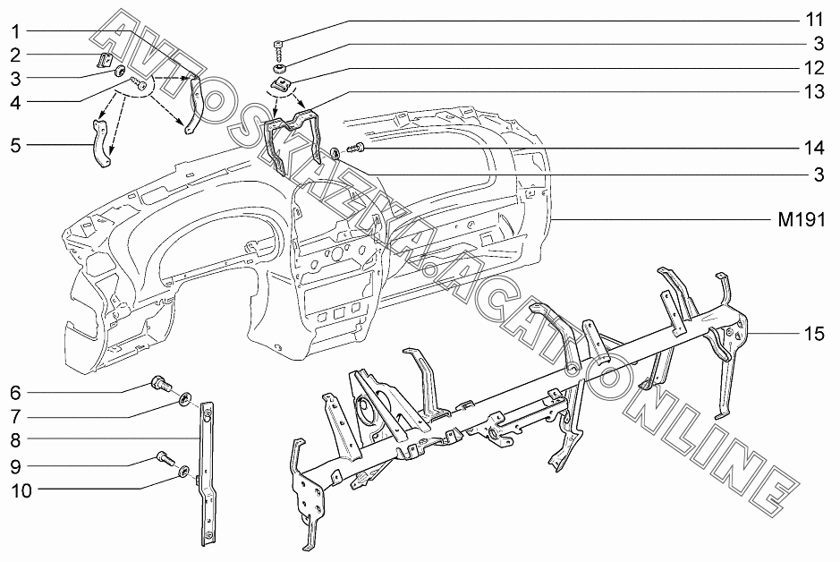 Поперечина и кронштейны панели приборов ВАЗ 1119 (11193-30, 11193-31, 11193-33, 11193-40, 11193-41, 11193-43, 11194-30, 11194-33, 11194-40, 11194-43, 11194-50, 11194-53 - "Калина" (хэтчбек) )