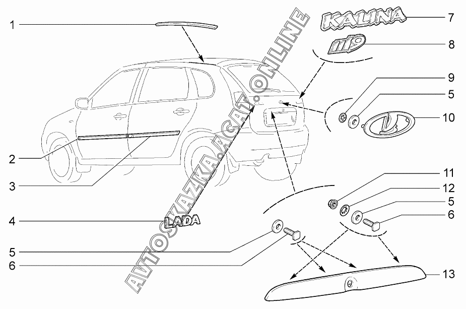 Орнаменты и накладки облицовочные ВАЗ 1119 (11193-30, 11193-31, 11193-33, 11193-40, 11193-41, 11193-43, 11194-30, 11194-33, 11194-40, 11194-43, 11194-50, 11194-53 - "Калина" (хэтчбек) )
