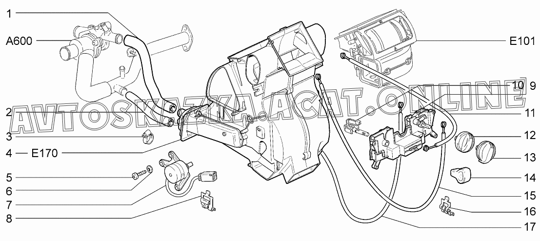 Отопитель с управлением и шлангами (климатическая установка) ВАЗ 1119 (11193-30, 11193-31, 11193-33, 11193-40, 11193-41, 11193-43, 11194-30, 11194-33, 11194-40, 11194-43, 11194-50, 11194-53 - "Калина" (хэтчбек) )