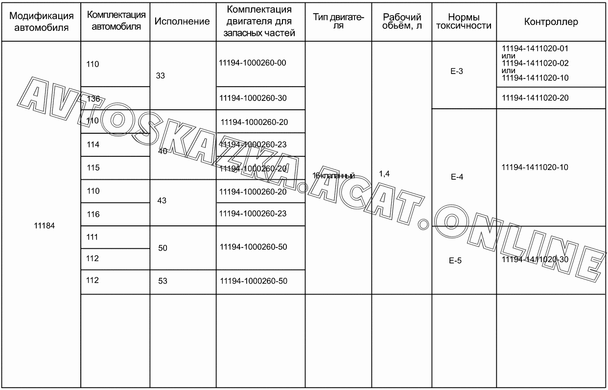 Комплектации двигателей для автомобилей ВАЗ 1119 (11193-30, 11193-31, 11193-33, 11193-40, 11193-41, 11193-43, 11194-30, 11194-33, 11194-40, 11194-43, 11194-50, 11194-53 - "Калина" (хэтчбек) )