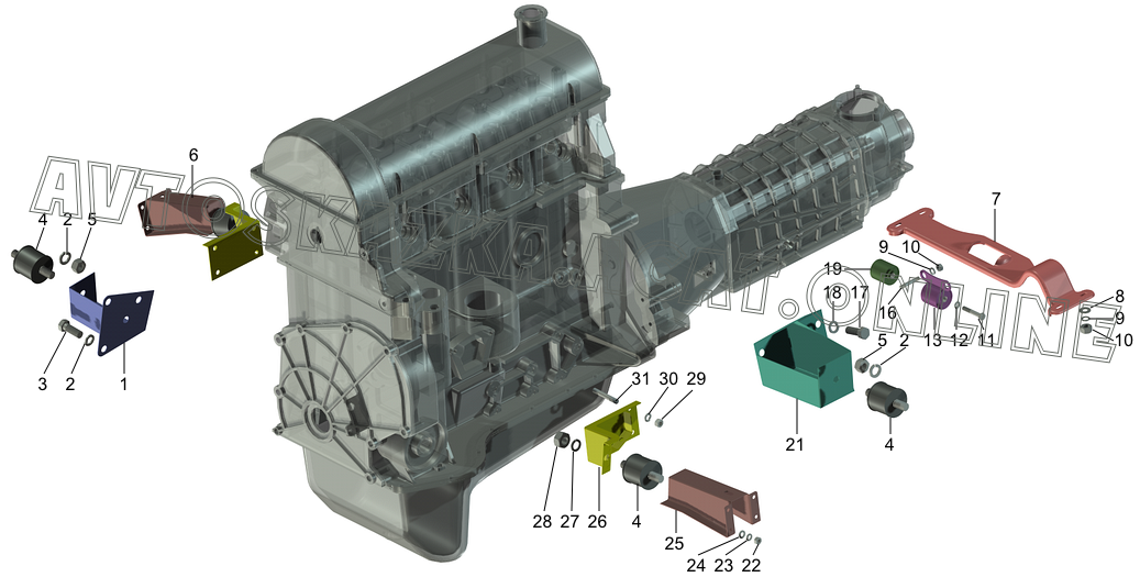 Подвеска двигателя ВАЗ 2121 (21213, 21214, 21214-10, 21214-20, 21215-10, 21216, 21217, 212146, 212146-10)